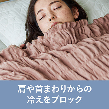 睡眠中、寝返りが多いせいか、肩、首が寒くて、カタログを見てコレだ!と思い購入しました。体を包んでくれて寒くならなくなりました。軽くて薄い毛布ですが、クシュクシュしたしたところに空気の層ができとても暖かいです。今回で4枚目を購入、色のバリエーションも増え家族の好みの色を選びました。